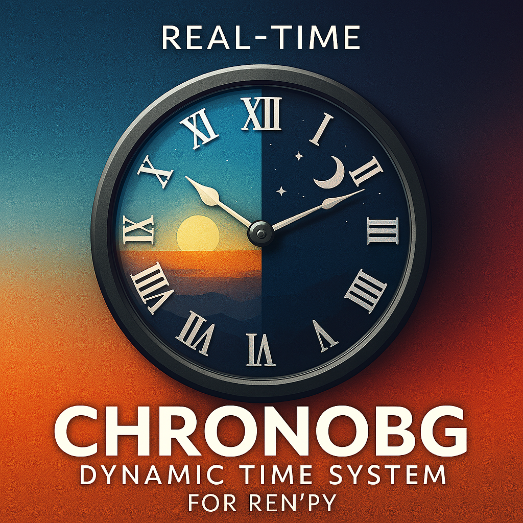 ChronoBG is lightweight, customizable, and designed for creators who want immersive, ambient time flow with minimal setup. By default 2 real-time minutes = 1 in-game hour. The day BG displays 5am - 8pm. The night BG displays 8pm - 5am. All of this is easily changeable in chrono_bg.rpy.